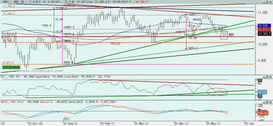 Miércoles 18 de Mayo de 2011: Jornada en el Ibex con apertura con gap alcista para luego caer por debajo del cierre de ayer y luego volver a subir en la última parte de la sesión, cerrando por debajo de la apertura. Sin embargo, a pesar de volver a cerrar por debajo de la MM200 en el gráfico diario, no hemos perdido los mínimos de hace dos sesiones cuando se dejó la señal de giro. La cosa está complicada, pero vamos a volver a dar las diferentes posibilidades.