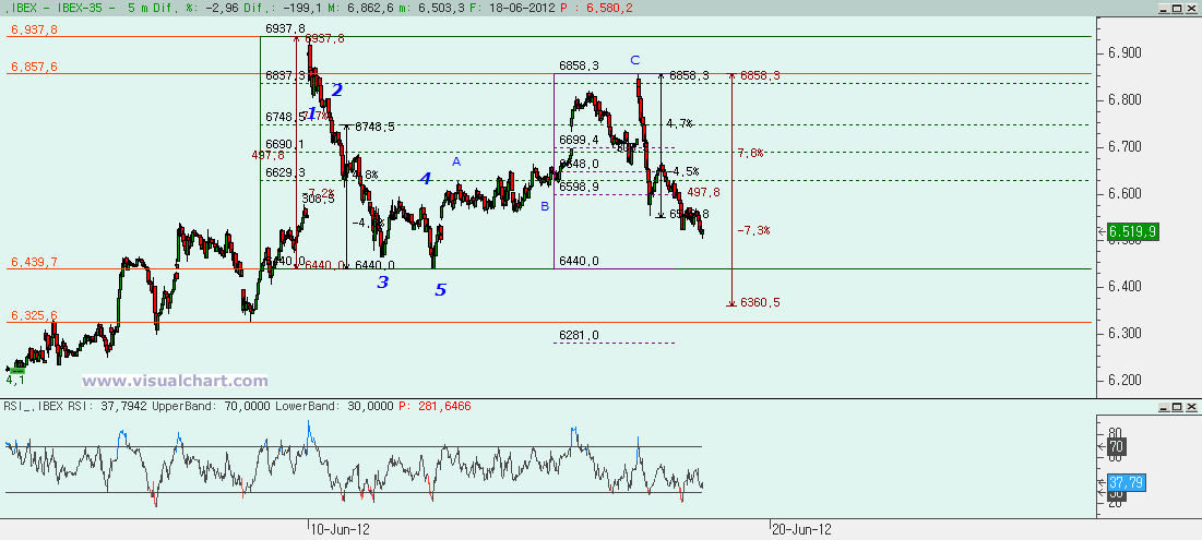 Viendo el recuento, parece que desde ese máximo del lunes pasado hemos hecho una A bajista, una B alcista en el máximo de hoy que ha llegado a un poco más del 80% y desde entonces deberíamos estar en la C. El primer mínimo del día ha coincidido con la proyección mínima para una C siendo igual al 61,8% de la A, pero el que luego hayamos hecho un nuevo mínimo parece decirnos que, por lo menos, deberíamos hacer una C igual a la A, con lo que deberíamos ir al 6.360. Y es que si hacemos una C entre el 100 y el 138% de la B debería darnos entre el 6.278 y el 6.439. Pero si la C fuera igual al 162% de la A esto nos daría un objetivo mucho más abajo, en la zona del 6.053, lo que ya sería corregir entre el 80 y el 100% de toda la subida.