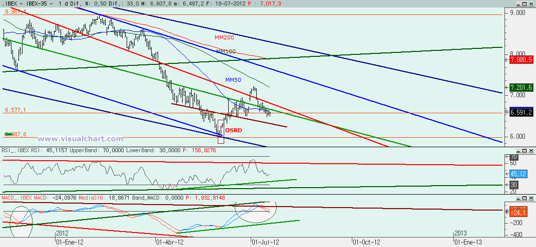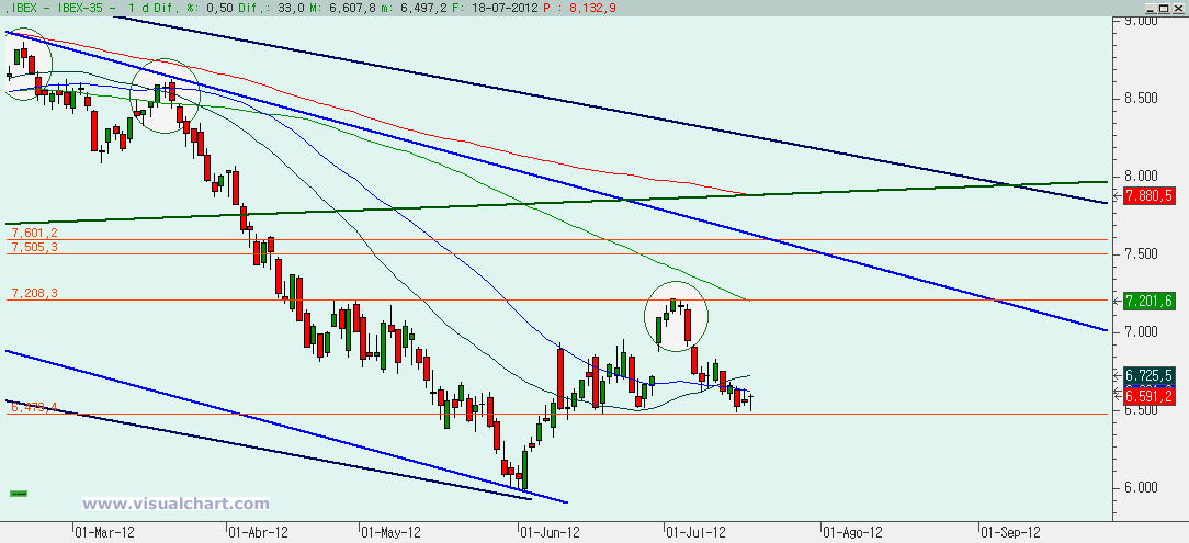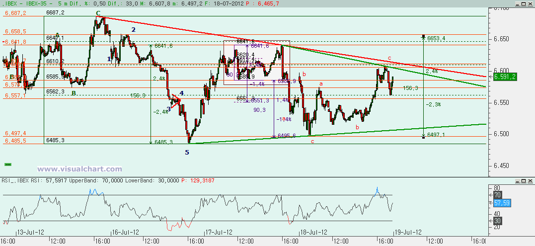 Miércoles 18 de Julio de 2012: Nueva jornada de vaivenes en el Ibex que nos deja más o menos donde estábamos y con la sensación de que estamos consumiendo el tiempo ante la cercanía de los vencimientos de julio del viernes. Y eso nos hace pensar que podemos estar triangulando. Vayamos con los gráficos.