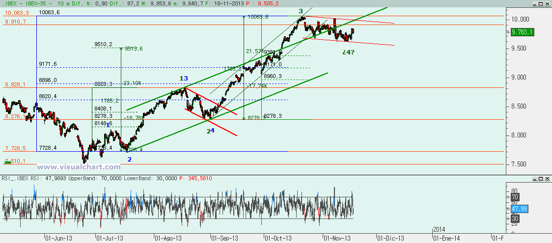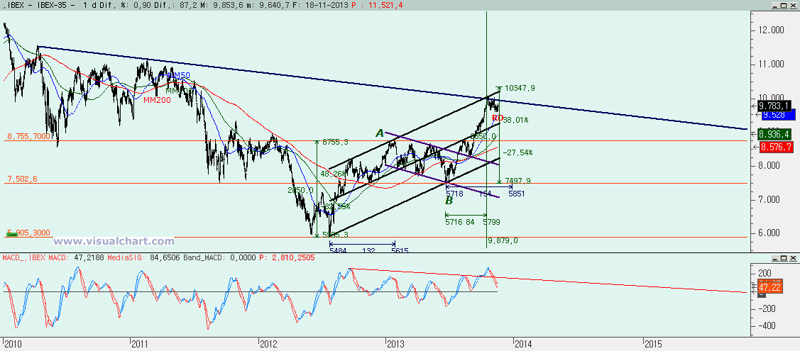 Gráfico diario: el RD de hace 10 días ha aguantado y ahora se trata de ver si el MACD se gira al alza de nuevo y rompemos la bajista desde 2010 o queda más por abajo. Si se rompiera la bajista el objetivo debería ser el 10.350 o el 10.560 que harían la C igual a la A (dependiendo de dónde haya empezado la C). La MM50 ya está cerca y pensábamos que iba a actuar de soporte, pero no ha sido ni necesario para subir. Y a la parte central del tridente ni nos hemos acercado. Eso sí, no hay que descartar que aún haya que ir por sus cercanías si es que la corrección no ha acabado.