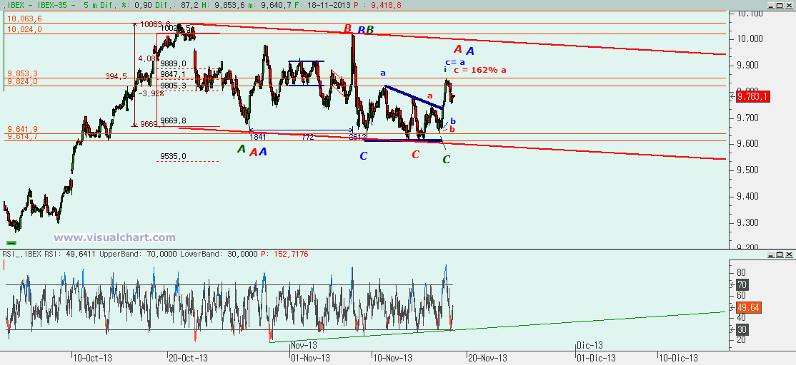 Gráfico desde máximos de octubre: habíamos dicho en su momento que parecía que estábamos haciendo una plana de libro. Pero el que no subiéramos de forma rápida tras finalizarla, hace pensar que esa plana no era toda la corrección. Entonces tenemos ahora tres posibles opciones a destacar: la primera es que realmente la plana acabara en el mínimo de hoy en fallo. Es decir, que la 5 de la C acabara en el mínimo de hoy y que entonces haya que subir y romper por arriba de manera rápida, habiendo sido el triángulo de días previos la 4 de esa C. Este es el recuento en verde. La segunda opción es que estemos haciendo ese ABCDE en la bandera, de modo que ahora tengamos que subir a la parte alta del canal para hacer la D y luego una E abajo. La C habría acabado en el mínimo del jueves y el máximo de hoy podría haber sido una a de la D de forma que se habría hecho en ABC con la (c) igual al 162% de la (a). Este es el recuento en rojo. Y la tercera opción es que la plana haya sido buena, pero solo una A de esta corrección y ahora haya que hacer una B. El máximo de hoy podría ser una el final de una a, ya que desde mínimos de la C el viernes 8 podríamos haber hecho una (a), una (b) en triángulo y la (c) igual a la (a). Ahora quedaría una b y después una c arriba para acabar corrección de la plana y luego una C abajo. Este es el recuento azul.