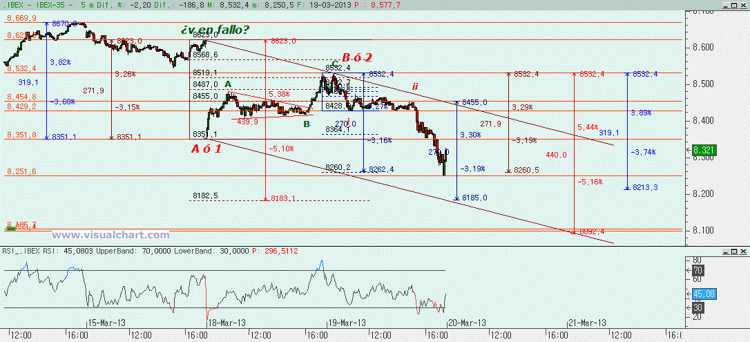 El gráfico desde máximos de la semana pasada nos mostraba un posible final del tramo alcista en fallo de v. Es por lo que habíamos apostado durante el fin de semana y lo que mejor explicaría el gap bajista del lunes y la continuación de la caída ahora. El rebote de ayer y comienzo de sesión de hoy habría llegado hasta la zona del 61,8% de la A ó 1, lo que es más típico de una 2, pero dejamos abiertas las dos opciones. El mínimo de hoy ha estado en la zona que haría la posible C ó 3 igual a la A ó 1 (apenas 9 puntos más para la C ó 3), pero parecería que aún debe quedar por abajo. Una C ó 3 igual al 162% de la A ó 1 nos da un 8.092, que está bastante abajo, la verdad. Pero si nos fijamos, hemos trazado un canal bajista posible en el que lo normal sería ir a buscar la parte baja del mismo. Podríamos haber hecho hoy una i y una ii de la C ó 3 y ahora estar en la iii. Como hemos estado por debajo de la cota que la haría igual al 162% de la i podemos pensar en que la iii debe ser igual al 262% de la i, lo que nos daría un 8.185, lo que encajaría con la parte baja del canal y ahí hacer una iv para luego hacer una v abajo con el objetivo en esa zona del 8.092. Y entonces evaluar si realmente hemos hecho una ABC o solo 3 de 5 bajistas.
