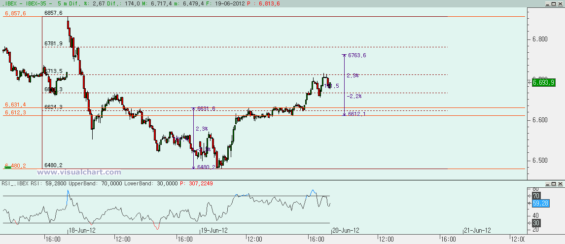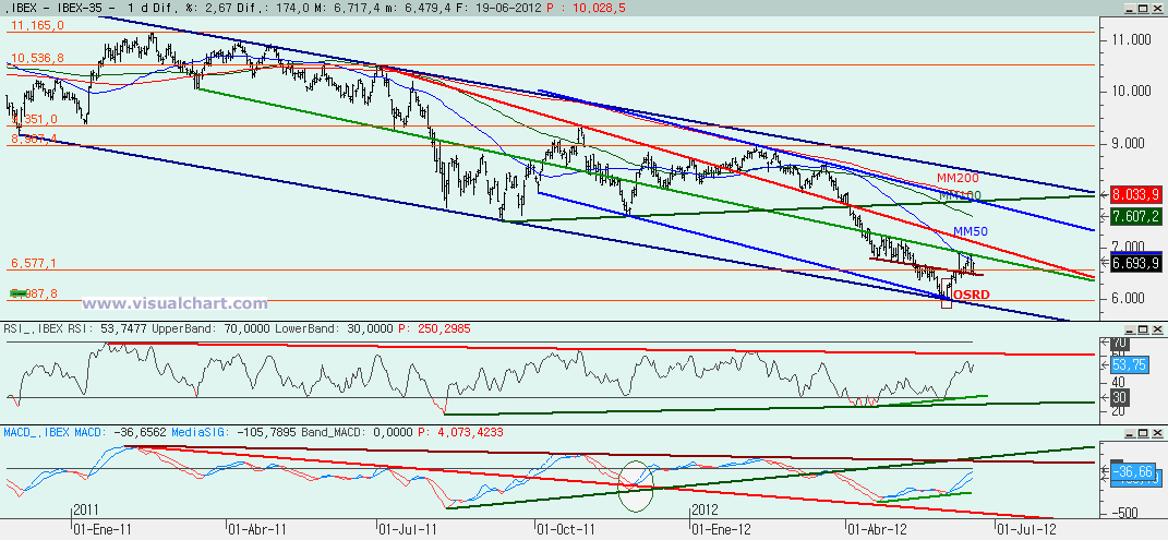 Martes 19 de Junio de 2012: Jornada alcista en el día de hoy en el Ibex tras un comienzo dubitativo pero la bajista granate de nuestro gráfico diario que dijimos era el soporte ha vuelto a actuar como tal y volvemos a intentar irnos a por la bajista verde que actúa como resistencia. Seguimos entre medias de las dos y mientras no rompamos no tendremos un movimiento mayor. Veamos los gráficos.