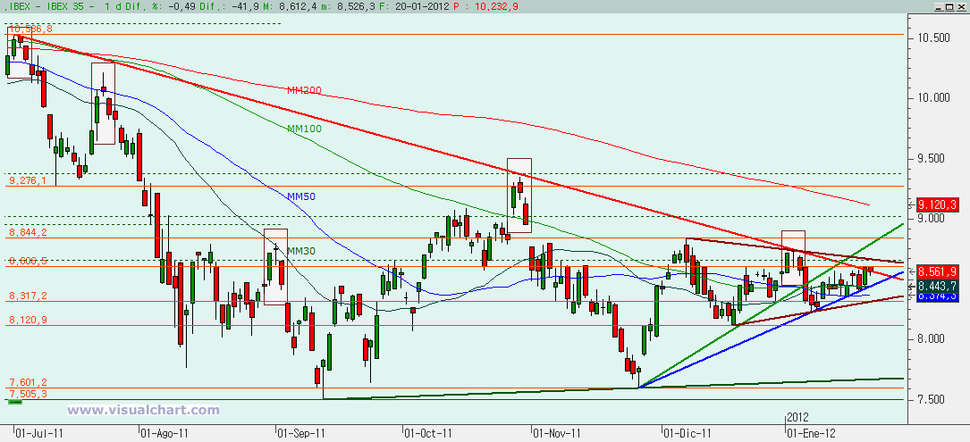 Domingo 20 de Enero de 2012: Jornada ligeramente bajista en el Ibex el viernes tras llegar a la zona que habíamos señalado el jueves como posible objetivo alcista. Sin embargo, la caída no fue demasiado severa y se limitó a un pequeño canal bajista que, además, se rompió al alza antes de finalizar la sesión. La pregunta ahora es si la caída del viernes fue toda la corrección o si debemos caer más. Vayamos con los gráficos para ver si podemos responder a esa pregunta.