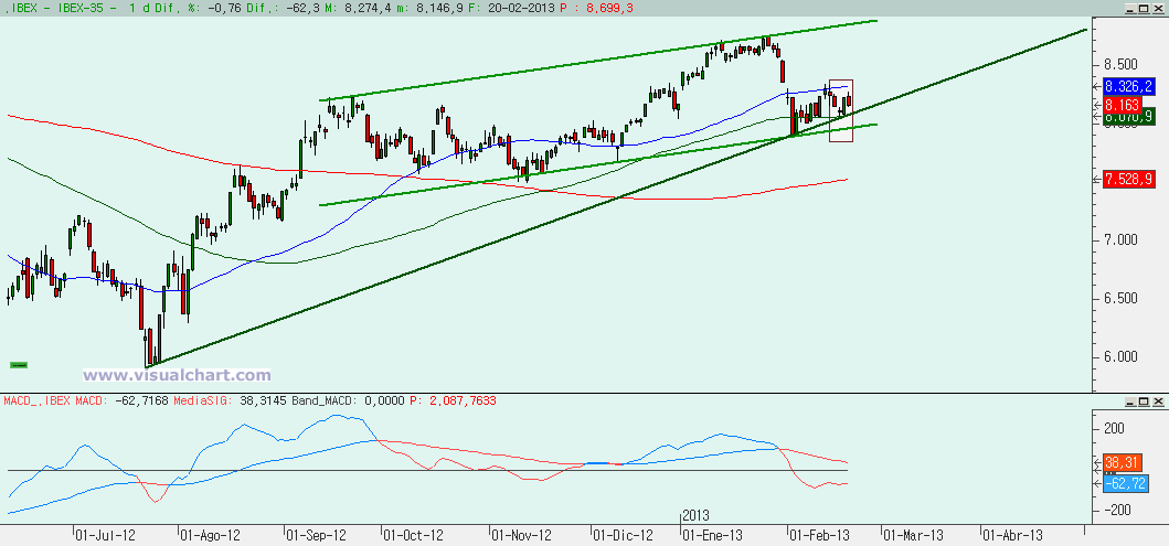 Tercer escenario: La corrección al tramo bajista desde máximos de enero se está formando en triángulo. Entonces el máximo de este mes habría sido la (a) del triángulo, el mínimo del lunes la (b), el máximo de hoy la (c), con lo que quedaría una (d) abajo, una (e) arriba que no podría superar el máximo de hoy y ahí finalizaría el triángulo y luego tendríamos que empezar un nuevo tramo bajista.