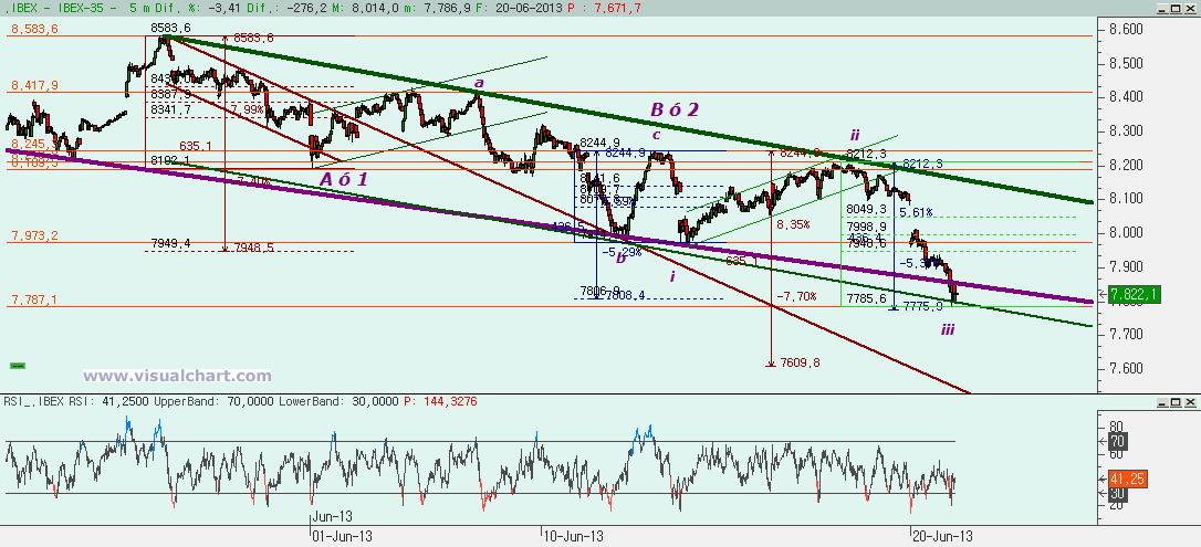 Gráfico desde finales de mayo: parece que las piezas empiezan a encajar. Hoy hemos perdido la bajista morada que venía frenando la caída estos días atrás. Pero nos hemos parado en la bajista paralela a la bajista verde, con lo que podemos tener un canal bajista ya formado. El recuento morado que pusimos en su día parece que puede ser el correcto. Habríamos hecho una A ó 1 y una B ó 2 y estaríamos ahora en la C ó 3, que podría tener un objetivo en el 7.609 para ser igual al 162% de la A ó 1. Dentro de la C ó 3 habríamos hecho una i y una ii y hoy el mínimo casi coincide con una iii igual al 162% de la i, por lo que podríamos tener que hacer una iv en los próximos días. Eso querría decir que la iv no debería ir más arriba de la zona del 7.940-7.998, pero si supera el 7.973 habría solape con la i y eso indicaría que es una pauta terminal y que esto sería una C.