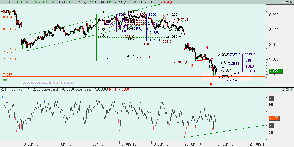 Haciendo un zoom en la que sería esa iii, vemos que podríamos haber hecho ya las 5 bajistas que la forman, con la 3 aproximadamente igual al 262% de la 1 y la 5 dentro del objetivo marcado entre el 7.754 y el 7.816. Pequeñas divergencias alcistas desde la 3 de la iii, que es lo habitual. Luego mañana hay que ver si hace falta un pequeño mínimo más para terminar esa iii o si ya rebotamos para hacer la iv, pero puede ser que ese rebote para la iv no sea demasiado pronunciado.