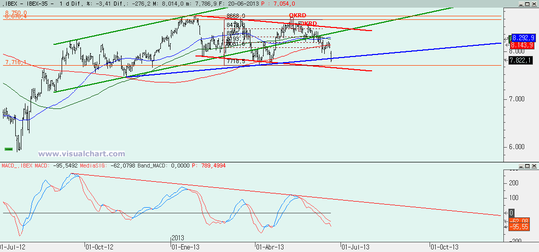 Desplome en el Ibex en el día de hoy tal y como pensamos que iba a pasar anoche tras la reunión de la FED y la comparecencia de Bernanke. Mañana tenemos los vencimientos y nadie parecía pensar que pudiera caerse así antes. Pero lo cierto es que la situación se está complicando para los alcistas. Veamos los gráficos.