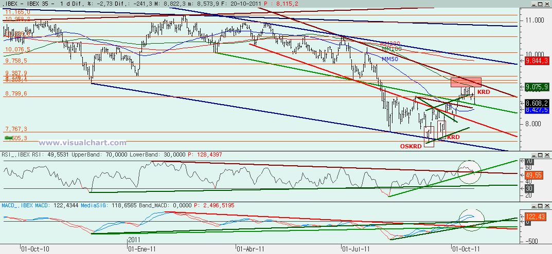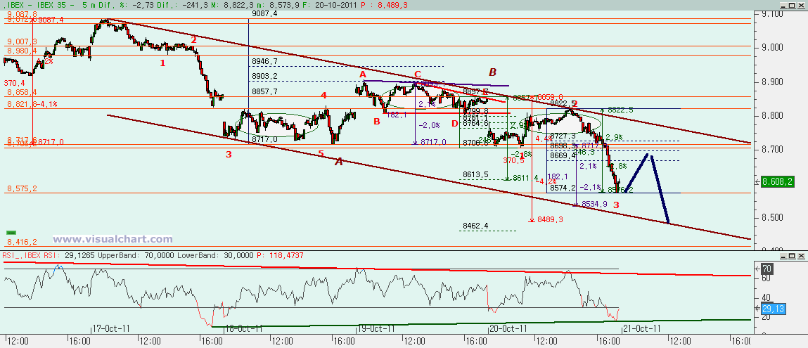 Jueves 20 de Octubre de 2011: Anoche señalamos tres escenarios posibles para la jornada de hoy: teníamos un triángulo y según por dónde lo rompiéramos tendríamos la clave para cuál podía ser el correcto. Los dos primeros escenarios se anulaban si perdíamos el mínimo de la jornada de ayer y el tercer escenario si superábamos los 8.900. El comienzo de la sesión, con gap bajista rompiendo el triángulo por abajo y perdiendo los mínimos de ayer ya nos daba el escenario ganador: el tercero y escenario bajista. Por tanto, la posición corta era la más indicada. Ahora se trata de ver hasta dónde deberíamos bajar, teniendo en cuenta que mañana es día de vencimietos. Veamos los gráficos para intentar descubrirlo.