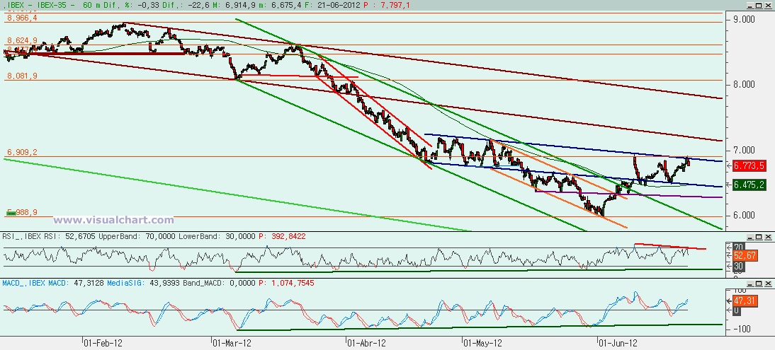 Jueves 21 de Junio de 2012: Jornada en el Ibex cuyo cierre nos ha dejado en un mar de dudas. Anoche planteamos un escenario que parecía cumplirse a rajatabla en el día de hoy: bajada inicial hasta muy cerca de donde señalamos anoche para hacer la posible E del triángulo para luego subir con fuerza y romper por arriba… Pero cuando todo parecía encajar, llegó la caída final, lo que hace que este escenario, aunque aún factible, se haya tambaleado. Pero vayamos con los gráficos a ver si podemos ver las opciones abiertas.
