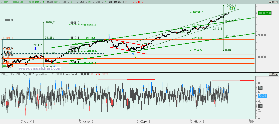 Los gráficos de tiempo menor muestran recuentos más complicados y dan objetivos alcistas mayores, pero queremos ver lo que sucede por esta zona, por la parte alta del tridente alcista, por la parte alta del canal alcista acelerado, por el 10.090. Y si superamos esta zona, si rompemos los canales alcistas por arriba, entonces habrá que poner esos recuentos tan alcistas. Por ejemplo, si vemos el recuento desde final de septiembre, podríamos tener 5 alcistas haciendo ahora la iii de la 3. Un objetivo para esa iii en el 10.287 (para ser igual al 162% de la i) y el objetivo para la 3 en el 10.320 (para ser igual al 162% de la 1). Pero esto vamos a dejarlo en entredicho mientras no veamos lo que ocurre por aquí.