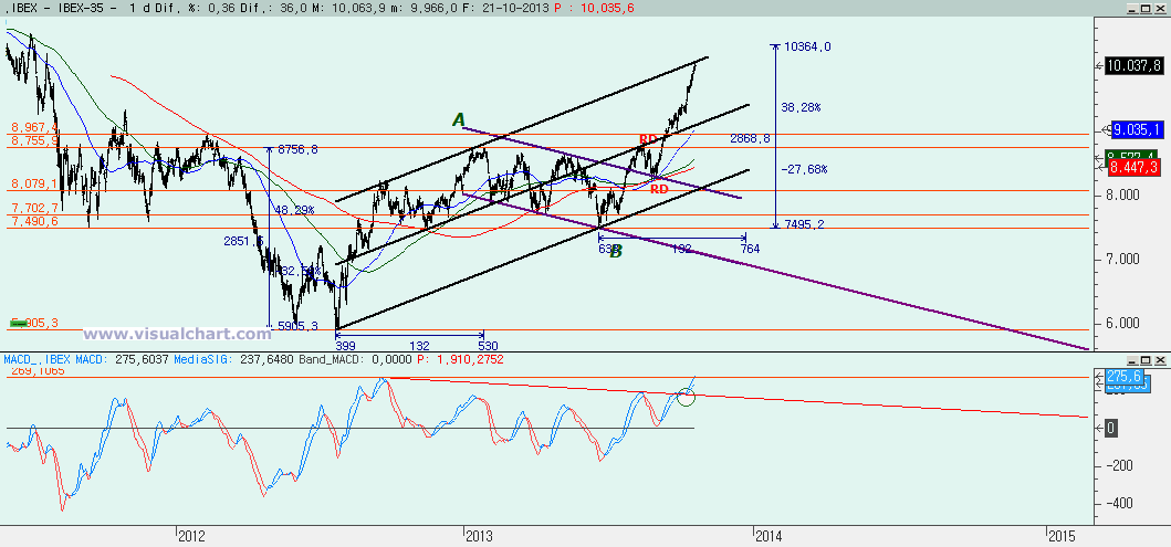 Gráfico diario: llegamos por fin a la parte alta del tridente alcista que nos habíamos marcado como objetivo cuando superamos la parte central e hicimos el throw-back correspondiente. Aunque aquí debería ser zona de parada, ya hemos dicho que el objetivo mínimo debería estar en el 10.358 para una C igual a la A, aunque si realmente el impulso comenzó el 17 de julio seguramente haya que revisar esta cifra y ponerle 200 puntos más. Lo que hoy sí que hemos hecho es superar la cota máxima del MACD del año pasado, lo que quiere decir que ya no existen divergencias bajistas de ningún tipo.