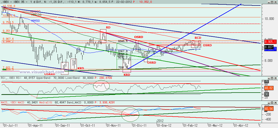Miércoles 22 de Febrero de 2012: Nueva jornada bajista en el Ibex tal y como era de esperar tras las señales bajistas dejadas ayer. Sin embargo, la caída no ha sido tan severa como cabía esperar y esto nos hace ser cautos, por lo que pueda pasar. Al final de la sesión hemos cerrado el gap alcista del lunes y es momento de evaluar si esto es suficiente o si hay que seguir bajando. Vayamos con los gráficos.