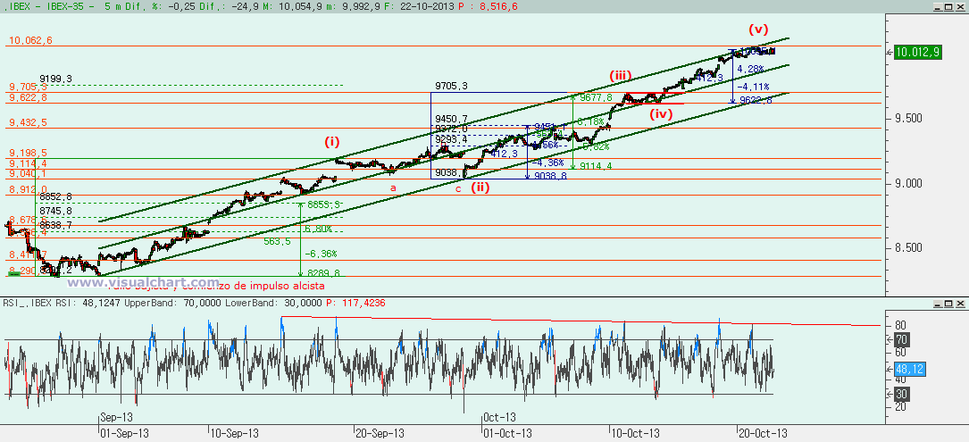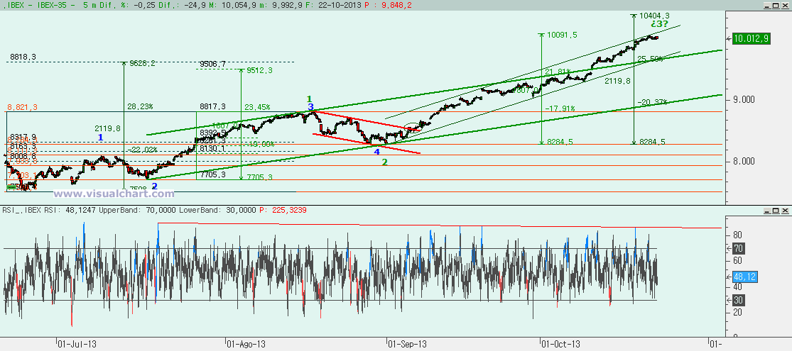 Gráfico desde finales de agosto: vemos el canal alcista acelerado que hemos marcado antes convertido en tridente alcista. La parte alta del mismo ha servido de freno y hay que ver si debemos volver a tocar esa parte alta o si nos vamos a por la parte central. Hemos puesto un posible recuento con 5 alcistas ya completas, con la (i) extendida, con la (ii) que apenas corrige, la (iii) igual al 61,8% de la (i), la (iv) en canal rectángulo y la (v) aproximadamente igual al 61,8% de la (iii). Si así fuera y el recuento fuera bueno, podríamos decir que hemos acabado la 3 del gráfico anterior y ahora tocar una 4. Para que el recuento sea bueno, la (v) no puede ser nunca mayor que la (iii), por lo que no deberíamos ir nunca por encima del 10.289. Lo cierto es que el recuento no parece el más probable, pero lo hemos reseñado por si acaso, ya que podría hacer encajar las piezas.