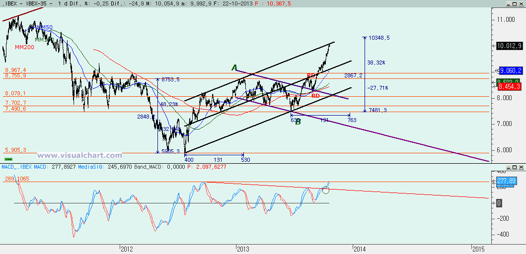 Gráfico diario: la zona alta del tridente alcista ha servido de freno, al menos de momento, al Ibex. Hay que estar atentos a lo que pueda hacer el MACD, que aunque está en máximos desde el año pasado, si se corta a la baja y más en la zona alta del tridente, sería la señal de una corrección. El objetivo final ya hemos dicho que debe ser el 10.350 por lo menos, pero puede ser que antes de conseguirlo tengamos que tener una corrección. Pero eso ya lo iremos viendo.