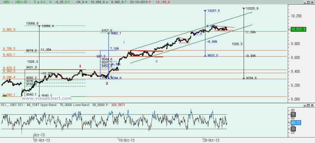 Gráfico desde finales de septiembre: el recuento que pusimos ayer puede seguir siendo vigente mientras no rompamos el canal alcista pero habría que llegar al 10.287 para una iii igual al 162% de la ii y eso parece lejano ahora mismo y más con los gráficos que hemos puesto antes. Pero la figura de hoy podría ser un triángulo descendente que marcaría otra nueva corrección para seguir subiendo. Sin embargo mientras no se rompa la figura por arriba no se confirmaría. Y si no se confirma, veremos lo que ocurre si llegamos a la parte baja del canal.