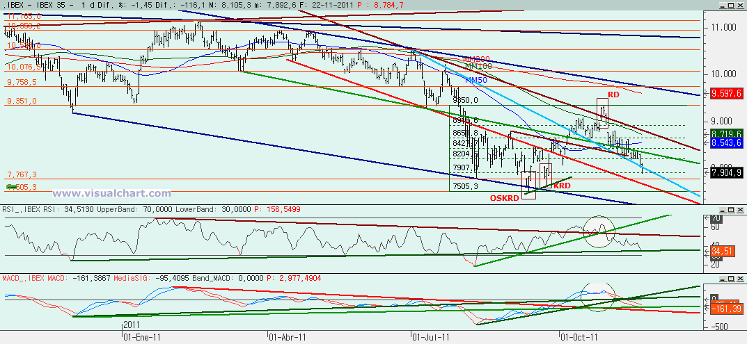 Martes 22 de Noviembre de 2011: Nueva jornada bajista en el Ibex para continuar con la tendencia de corto iniciada a finales de octubre cuando dejamos una señal de reversal day en el gráfico diario tal y como anunciamos entonces. Desde ese momento el Ibex ha caído 1.600 puntos en menos de un mes, lo que da idea de la potencia de esa señal. Y una señal así es la que estamos buscando estos días para ver un giro en el gráfico diario que nos pueda indicar la posibilidad de un rebote algo más sólido. Mientras tanto, aunque lleguemos a objetivos bajistas, los largos que podamos abrir deben tener fecha de caducidad muy cercana. Como hemos dicho, mientras esa señal no exista, los largos debemos protegerlos con un stop profit tan pronto como podamos y cerrarlos al llegar al primer objetivo alcista, aunque sea una parte de los largos y no todos. Ya habrá tiempo, cuando tengamos esa señal alcista de poder dejarlos algo más de tiempo. De momento, la cosa sigue complicada. Veamos los gráficos.