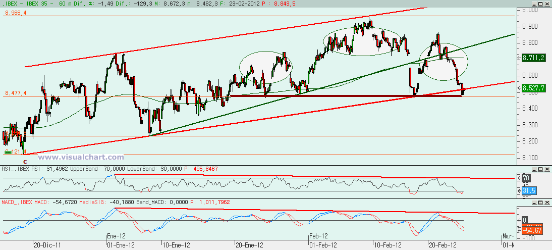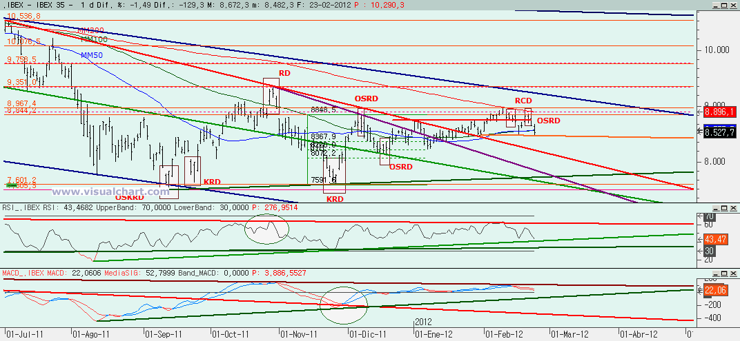 En el gráfico diario vemos como el cierre de hoy está ligeramente por debajo de las MM50 y MM100 que eran las que delimitaban por abajo nuestro rango desde hace más de un mes. El OSRD de hace dos días ha vuelto a ser eficaz y nos está dejando ya bastantes puntos hacia abajo. Pero vemos como el RSI está llegando ya a la alcista. El MACD sigue cuesta abajo y está ya cerca del nivel cero. En estos momentos es cuando la directriz naranja entra en escena. Tenemos, pues, al Ibex en la zona de soporte de las MM50 y MM100, de soporte de la directriz naranja y casi en la alcista del RSI. ¿Romperemos o rebotaremos aquí?