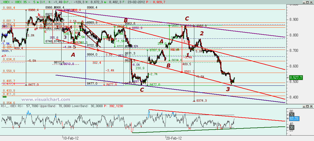 Jueves 23 de Febrero de 2012: Nueva jornada bajista en el Ibex como continuación a las figuras bajistas desarrolladas días atrás. Anoche planteamos dos escenarios posibles en los que ambos nos daban un primer tramo bajista inicial, pero uno de ellos era más bajista. Y cuando vimos que perdíamos la cota señalada como objetivo del segundo escenario nos dimos cuenta de que el correcto era el primero y fuimos siguiendo el escenario con bastante precisión. Ahora se trata de ver si ese escenario nos muestra el mínimo de hoy como una onda 3 desde máximos del martes o si ha sido todo una ABC. Si ha sido una 3 debemos aún bajar más. Si ha sido una ABC deberemos subir con fuerza. Vayamos con los gráficos para ver si podemos resolver la duda.
