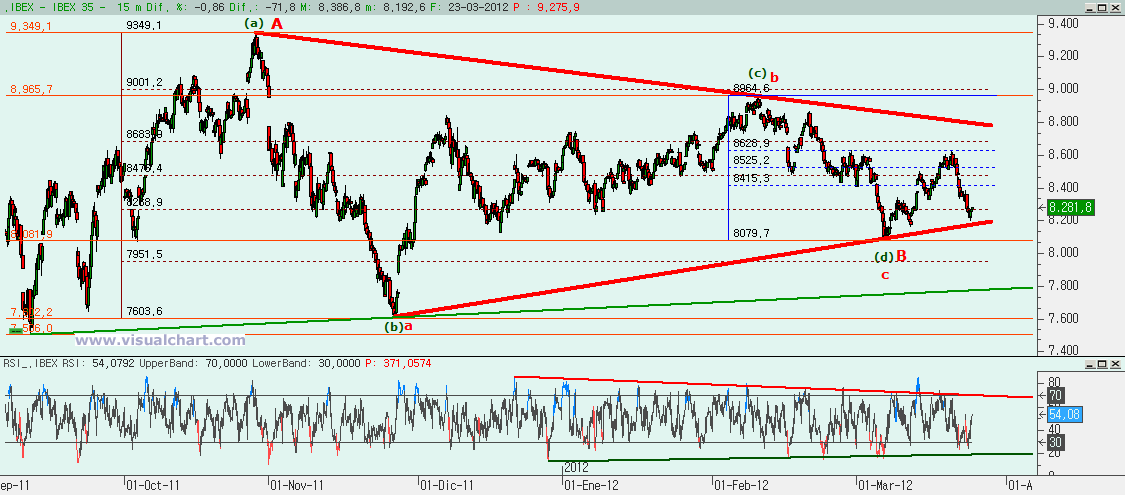 Por tanto, mañana hay que esperar rebote de inicio y dependiendo de hasta dónde llegue, pensaremos que debemos hacer un tramo más hacia arriba o uno más hacia abajo. De momento a corto vigilamos esa zona del 8.308-8.344 para ver si esto es una iv o no. Si se supera, entonces tenemos las otras dos opciones abiertas, la de haber terminado 5 bajistas, lo que implicaría que esta subida es solo una corrección y la de haber hecho una ABC, lo que significaría que vamos a hacer un segundo tramo alcista de lo que podría ser la (e) del triángulo. Veremos lo que sucede.