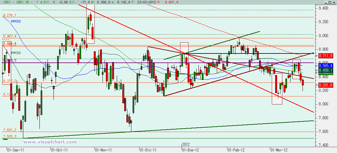 Domingo 25 de Marzo de 2012: Jornada bajista de nuevo el viernes que lleva al Ibex por debajo de los niveles de control que teníamos pero que nos deja al final de sesión un intento de remontada en una cota muy interesante. Veamos lo que nos puede deparar el Ibex esta semana.