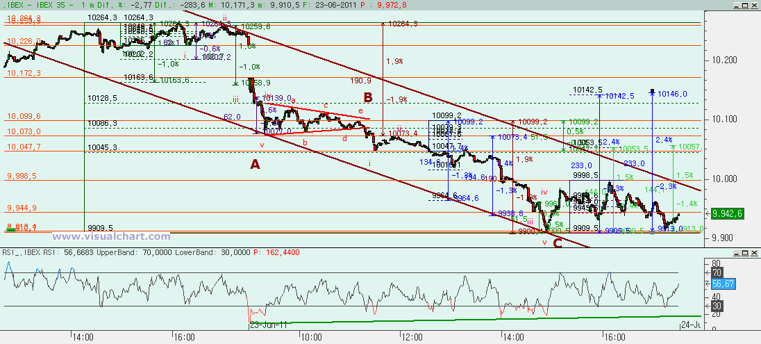 Por último, señalar que si realmente esta caída de hoy ha sido una B desde mínimos de la semana pasada, el primer objetivo para un rebote estaría en los 10.192 para hacer la C igual al 61,8% de la A, el segundo en los 10.368 para hacerla igual a la A y, el último en los 10.658 para hacer la C igual al 162% de la A.