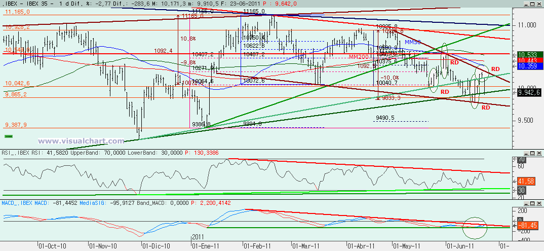 Jueves 23 de Junio de 2011: Jornada de fuertes caídas en el Ibex tal y como parecía anunciarnos ayer la figura que señalamos en el gráfico diario de Reversal Day. Eso sí, la caída ha sido mucho más severa de lo que podíamos pensar, de modo que ya nos hemos llevado casi toda la subida desde mínimos de la semana pasada. Ahora debemos pensar en si esto ha sido la primera parte de un nuevo tramo bajista, si vamos a tener un parón o si vamos a iniciar un tramo alcista. Veremos lo que los gráficos nos dicen y si podemos interpretarlos correctamente.