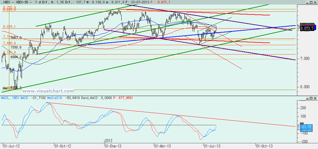 Gráfico diario: vemos que la superación de la parte alta del canal bajista nos ha llevado directamente a la zona de la MM200, MM100 y MM50, que es zona clara de resistencia. Si la superáramos, deberíamos irnos directamente a la parte alta del canal bajista morado, lo que parece factible estando el MACD en la disposición en la que está, que parece que va directamente a por la bajista, aunque aún falta mucho para eso y más estando aún por debajo del nivel 0.