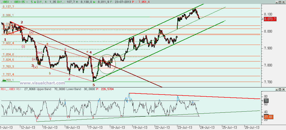 Gráfico desde mínimos de la semana pasada: el recuento está complicado. Parece que podemos tener 5 ondas al alza, pero también podría ser un ABC en el que estemos haciendo la C ahora. El caso es que lo que vamos a seguir es el canal alcista perfecto que se está siguiendo y el tridente. De momento en la parte alta del mismo hemos cedido y el cierre está en la parte central del mismo. Si se pierde, habrá que ir a la parte baja y ahí ver qué pasa. Si no cede, podríamos ir a por la parte alta de nuevo.