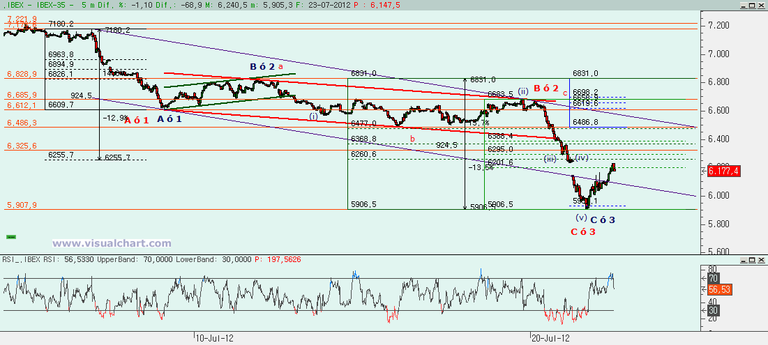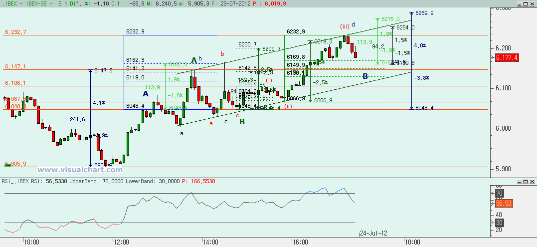 Y por fin, desde mínimos del día, el recuento podría ser el verde, en el que habríamos hecho una A y una B y estaríamos en la C, que si fuera igual a la A nos daría un 6.289. Podríamos haber hecho hasta la (iii) y ahora estar haciendo la (iv) antes de la (v). Para que sea bueno este recuento, la (iv) no debería bajar de la zona del 6.149-6.169, para luego hacer una (v) arriba entre 94 y 113 puntos arriba desde que terminara la (iv). Si perdemos el 6.106 se confirmaría que no es el recuento correcto. Pero también existe la opción del recuento azul. Habríamos hecho la A y ahora estaríamos haciendo la B en canal alcista, de modo que habríamos hecho ya hasta la d y ahora la e antes de hacer una C alcista, que si fuera igual a la A nos daría 177 puntos arriba.