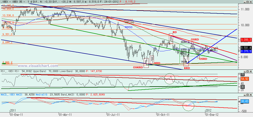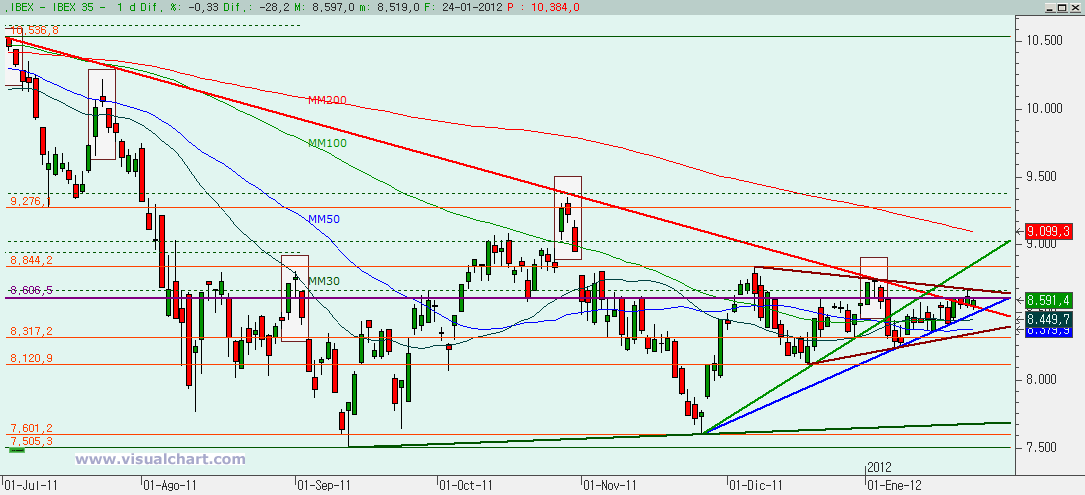 Martes 24 de Enero de 2012: Jornada de ligera corrección en el Ibex tal y como señalamos anoche. En el corto plazo habíamos hecho 5 alcistas desde el 18 de enero y no cabía otra que corregir. La pregunta es si la corrección debe ser a esas 5 alcistas, al tramo de subida desde el día 6 (en lo que habría sido parte del triángulo desde diciembre) o si no va a ser una corrección sino una caída mayor. La respuesta la tenemos en los gráficos. Vayamos con ellos.