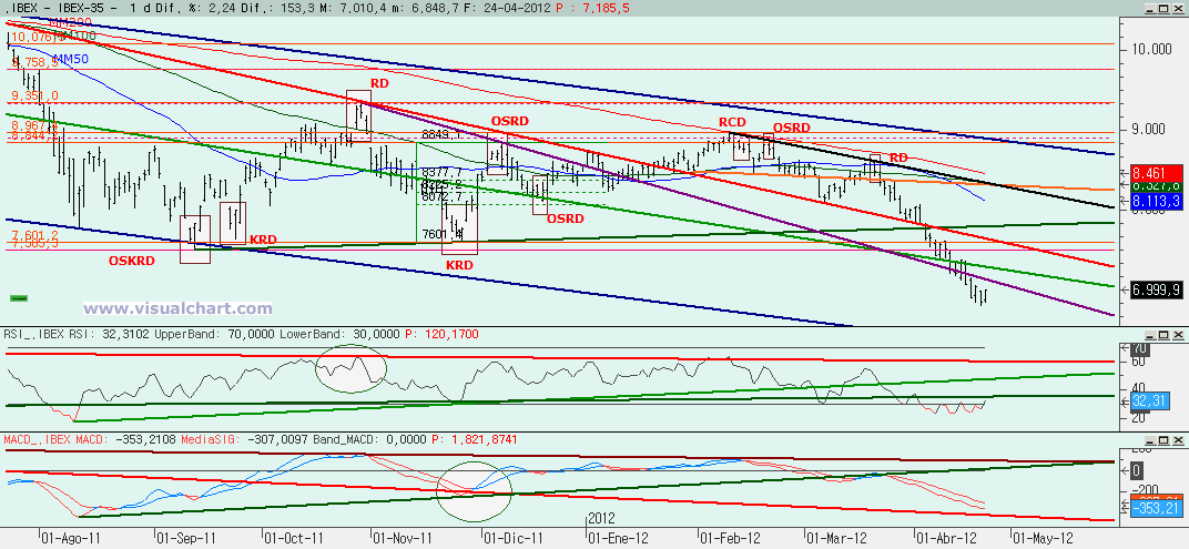 Martes 24 de Abril de 2012: Jornada de rebote en el Ibex en el punto señalado para ello, por lo que parece que, por fin, el escenario que tenemos puede ser el correcto. Desde máximos de marzo podríamos haber completado 3 de 5 bajistas, con lo que ahora estaríamos haciendo la 4 antes de hacer una 5 bajista para concluir este impulso bajista. Después… Pues después ya habría que ver qué supone ese impulso a medio plazo, pero lo primero es completar el recuento. Veamos con lo que nos dicen los gráficos.
