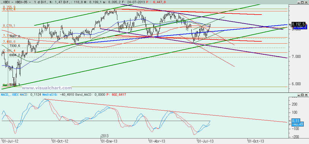 Nueva jornada alcista en el Ibex continuando la tendencia marcada en los últimos días y siguiendo a la perfección el canal alcista. El cierre está ya por encima de la MM200 del gráfico diario y en la MM100 de ese gráfico. Si confirmamos la superación de esta zona, lo más normal será ir a la zona del 8.400. Pero veamos los gráficos.