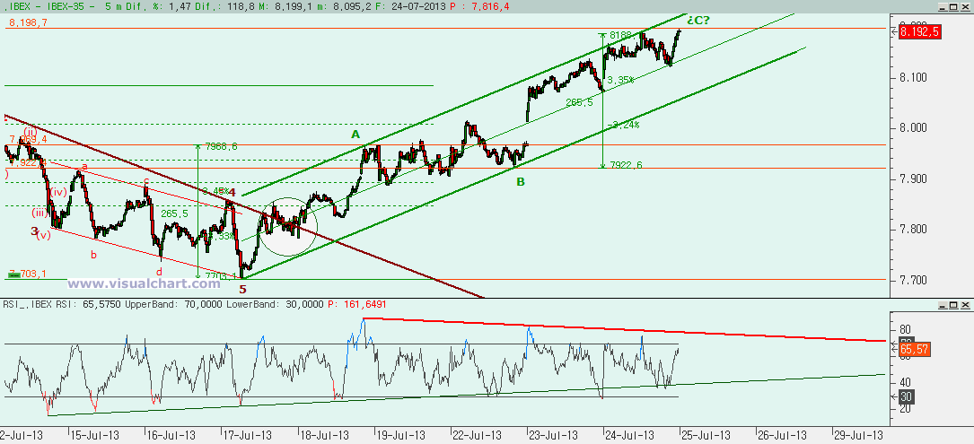 Gráfico desde mínimos de la semana pasada: seguimos el tridente alcista a la perfección, con toques en la parte alta del mismo que suponen pequeños cortos a la parte central del mismo y luego rebote a la parte alta del mismo. Recordemos, en la parte alta se pueden abrir cortos y en la parte central largos. Si se pierde la parte central, cortos hasta la parte baja del mismo y ahí largos. Y así mientras sigamos dentro del mismo. Algunos piensan que este movimiento es un ABC, en el que una C igual a la A nos daba un 8.188, con lo que o nos giramos ya mismo, o es que vamos a ir mucho más arriba. Las divergencias bajistas son evidentes ahora, pero puede ser que quede aún por arriba. Si la C fuera igual al 162% de la A, tendríamos un objetivo en el 8.352… Y entonces evaluar si en lugar de un ABC es una 3 de 5 alcistas.