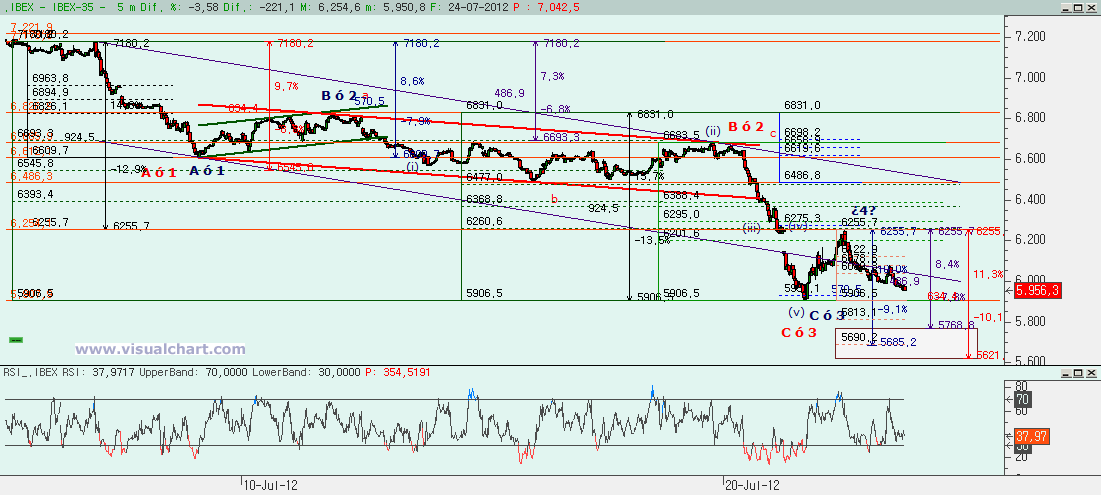 En cuanto a nuestros escenarios de anoche planteamos dos opciones en las que había que averiguar si lo que estábamos haciendo era un ABC bajista o si eran 5 bajistas. Y marcamos unos niveles para los dos escenarios como punto máximo del rebote para pensar en que podría ser una 4. Y el máximo de hoy se ha quedado ahí y nos hemos ido a zonas de mínimos, lo que parece decirnos que ha sido una 4 y que ahora puede estar viniendo una 5. Entonces tendríamos un objetivo para una 5 bajista entre el 5.612 y el 5.768.