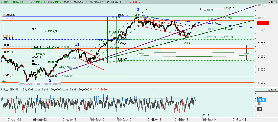 Gráfico desde mínimos de junio: teníamos la duda de si habíamos hecho 5 alcistas completas en el recuento azul o si estábamos en el recuento verde y estamos ahora en la 5. La superación de la alcista morada que era la 2-4 del recuento azul parece decirnos que el recuento bueno es el verde. Pero para eso hay que romper la bajista azul y estamos ya en ella. Eso nos daría carta blanca para ir a máximos del año y seguramente algo más, pues el objetivo inicial para una 5 debería estar entre el 10.333 y el 10.400. La única opción para que estemos en el recuento azul es que nos giremos inmediatamente y perdamos de nuevo la alcista morada y luego la alcista verde, pero ya decimos que todo parece indicar que habrá que romper por arriba.