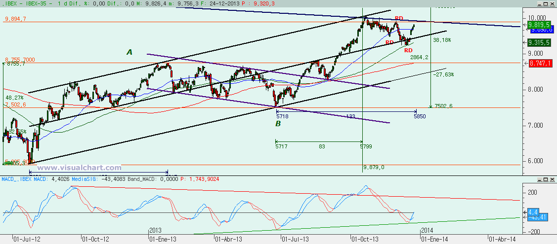 Gráfico diario: tras cortarse el MACD al alza al llegar a la alcista desde 2011 y dejarnos un RD, la subida sigue imparable y ya estamos llegando cerca de la bajista desde 2010 que es la que frenó la anterior subida. Si llegamos a superarla ahora, entonces habrá que pensar en continuación de la subida y mínimo llegar a la zona del 10.500 con objetivo claro la parte alta del tridente alcista.
