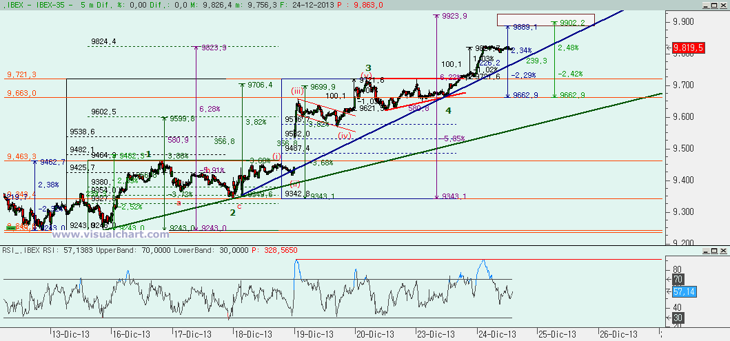 Tras unas jornadas de fiestas, mañana vuelve a abrir la bolsa de Madrid. El día de Nochebuena volvimos a subir tal y como pensábamos y ya nos deja muy cerca del objetivo alcista que nos habíamos marcado para la 5 desde mínimos de mes. Veamos los gráficos actualizados.