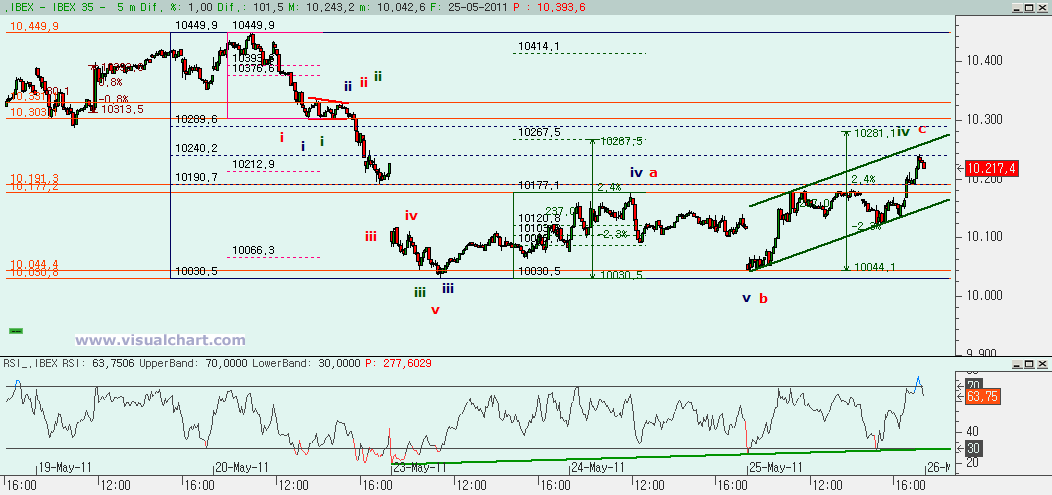El caso es que si miramos el gráfico desde mínimos del Lunes, las diferentes opciones nos dan objetivos alcistas distintos. Si consideramos el doble suelo formado, el objetivo alcista estaría en los 10.317, algo por encima del objetivo en los 10.281-10.289 que hemos señalado antes, y por encima de los 10.303, con lo que se anularía la opción de que esto sea una iv (realmente parece poco probable, por su duración). Pero si pensamos que desde el mínimo de hoy es cuando hemos empezado el tramo alcista, entonces el primer objetivo alcista estaría en los 10.347 para hacer una posible iii desde mínimos de hoy igual al 162% de la i. El stop de largos estaría en el 10.180 y no se podría perder la alcista del canal verde señalado desde mínimos de hoy. Y podríamo tener un objetivo alcista final en la zona del 10.400 o incluso en el 10.480.