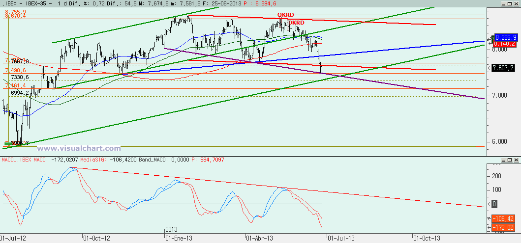 Gráfico diario: lo más interesante es resaltar la bajista morada que viene de unir mínimos desde diciembre del año pasado que indicó Oanico y que es la que está frenando todas las caídas desde entonces. Ahí hemos parado ayer otra vez y hay que ver si se sigue manteniendo o no. Desde luego, era un buen sitio para frenar la caída, la unión del soporte de mínimos de noviembre y la bajista morada. De todos modos el MACD sigue estando cortado a la baja y sin dar señal de querer reducir su pendiente aún. Aunque ya hemos dicho que podríamos hacer un hombro derecho por aquí para un HCH y que seguiremos muy atentos su posible formación.