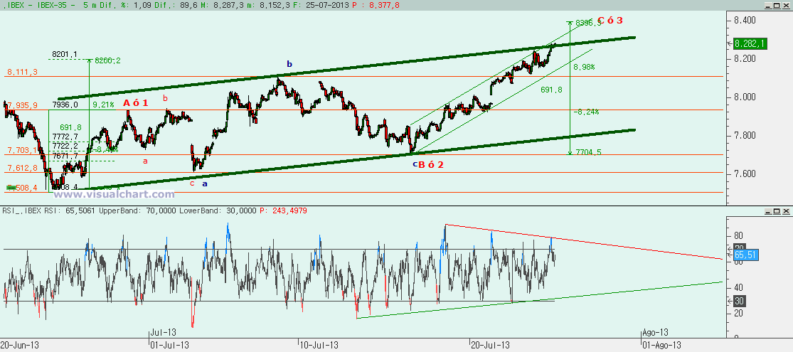 Gráfico desde mínimos de junio: como hemos dicho, el cierre de hoy está en la parte alta del canal alcista, pero hay que ver si se trata de un ABC alcista, si son 5 alcistas o si en el mínimo de mediados de julio hemos hecho un fallo bajista y no hay relación entre la subida inicial desde mínimos de junio y el tramo actual. Bien, si se trata de un ABC o de 5 alcistas, una C ó 3 igual al 162% de la A ó 1 nos daría un 8.396. Si en esta zona paramos y nos vamos abajo y rompemos la parte baja del canal alcista rápidamente, es que ha sido un ABC. Si hacemos un parón y luego seguimos subiendo, será una 4 y la subida posterior una 5. Y si no hacemos nada en esa zona, lo más probable es que haya habido fallo bajista y esto solo sea el inicio de un tramo alcista mayor.