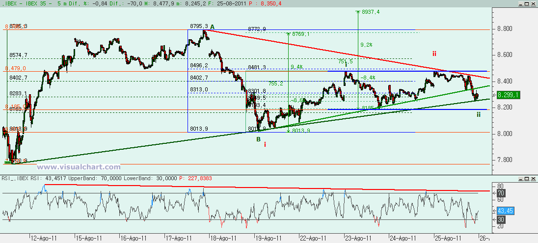 Si, por el contrario, en la marcada como A hubiera terminado todo el rebote, entonces deberíamos estar haciendo 5 bajistas desde entonces y el mínimo del día 19 habría sido la i y ahora estaríamos haciendo la ii que podría haber terminado ayer, con una C igual al 61,8% de la A y desde entonces empezar la iii bajista. Evidentemente, esto se anularía si superamos los máximos de ayer, aunque antes podremos tener una pista si rompemos la bajista en rojo (sería la 0-ii), ya que entonces no podríamos estar aún en la iii. De momento, mientras no rompamos el rango 8.185-8.480 no podemos asegurar nada. Cuando se rompa… Pues entonces empezaremos a tener pistas, con las bajistas y alcistas ya dándonos más información.