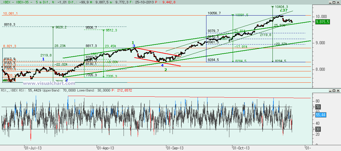 Gráfico desde mínimos de junio: el que hayamos parado en las inmediaciones del 10.091 parece indicar que realmente estamos en el recuento verde y hemos podido acabar una 3. Y más si rompemos el canal alcista acelerado que se estaría siguiendo en esa 3. Porque si se rompe ese canal (y el viernes acabamos en la parte baja del mismo), sería señal de que en el máximo de hace unos días hemos acabado algo. Y si el recuento no fuera el verde sino el azul y esto fuera una 5 extendida sería señal de que hemos acabado un impulso alcista y deberíamos olvidarnos de subidas y de rally de navidad. El caso es que ahora mismo deberíamos pensar en que estamos en el recuento verde y que estamos ya en la 4 cuyo objetivo debería estar entre el 9.170-9.379. Y nunca por debajo del 8.821.