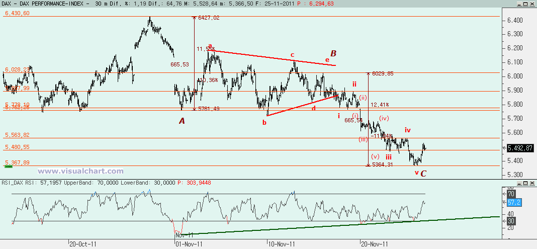 Si miramos el gráfico del DAX que hemos venido señalando en los últimos días, nos damos cuenta de que hicimos el viernes el mínimo que nos faltaba en el rango previsto. La C habría sido igual a la A y la v de esta C habría estado dentro del rango que señalamos. Tenemos la ABC desde máximos de octubre prevista, lo que nos hace pensar que vamos a volver a esos máximos de octubre. Es decir, que queda por hacer la segunda parte del rebote. La superación del 5.761 nos confirmaría que esto no son 5 bajistas, sino que ha sido una ABC y queda esa segunda parte del rebote, seguramente hasta los máximos de octubre o incluso un poco más.
