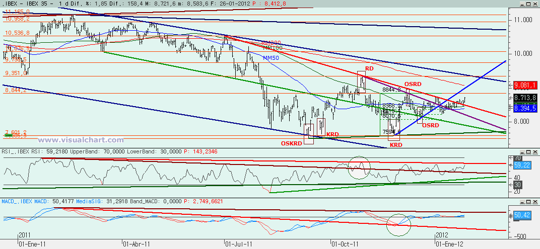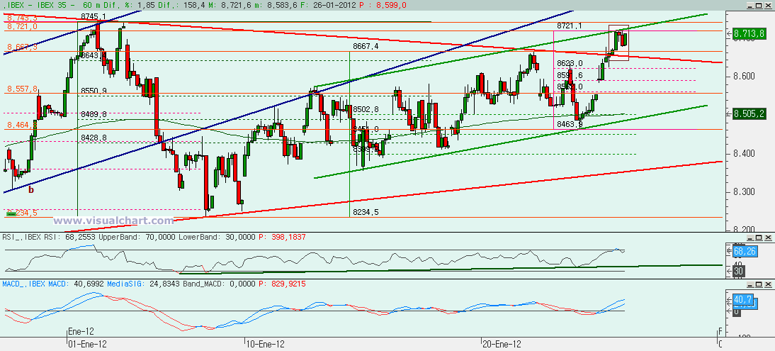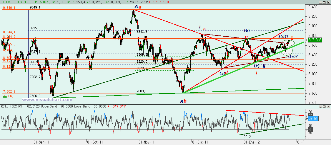 Jueves 26 de Enero de 2012: Jornada alcista en el Ibex para romper el triángulo en el que estaba metido desde hacía más de un mes. Anoche señalamos dos posibilidades, la primera en la que podríamos haber terminado la (e) de ese triángulo y que tocaría romper hoy por arriba. La segunda una alternativa por si ese recuento, que parecía tan perfecto, no era bueno. Pero señalamos qué bajista era la que no se podía romper para evitar que el segundo recuento no se anulara. Tan pronto como se rompió, se activaba el primer escenario y parecía decirnos que la rotura del triángulo era inminente. Ahora la pregunta es si esta rotura es buena y, por tanto, deberemos seguir subiendo o no. Vayamos con los gráficos.