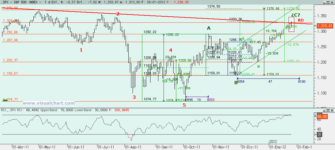 Y para terminar vamos a ver algo muy interesante, el gráfico del SP500. En su momento dimos un recuento para el SP500 en el que decíamos que entre el 1.333-1.336 podría tener un objetivo alcista, ya que ahí estaba el retroceso del 162% del primer tramo alcista de la posible C. Además, por aquí pasaba la bajista desde medio plazo. Pues bien, hoy ha llegado ahí y se ha girado dejando esa señal de giro que tanto nos gusta, un RD. Eso quiere decir que son cortos con stop en el máximo de hoy más pequeño filtro. Y si aquí son cortos y el índice puede caer, ya veremos cuánto, el Ibex, ¿va a subir? Habrá que ver lo que sucederá.
