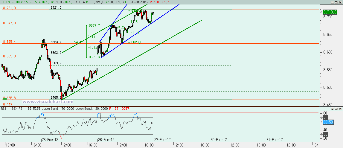 El gráfico horario nos presenta un Ibex en un canal alcista desde el día 12 con el máximo de hoy justo en la parte alta y dejándonos ahí una estrella vespertina (aunque la vela posterior no es de confirmación), justo además cuando el RSI llegó ya a zona de sobrecompra, aunque sin presentar aún divergencias bajistas. Esto podría indicarnos una corrección desde aquí pero no demasiado profunda. Una corrección del 50% nos daría el 8.590, una del 61,8% el 8.560 para cerrar el gap de hoy. Entonces, si la opción del triángulo fuera buena, y éste hubiera acabado ayer, podríamos haber hecho hoy la i y ahora podríamos hacer la ii. Y luego deberíamos romper el canal alcista por arriba para hacer un canal acelerado. A menos que este recuento no sea bueno. De todos modos, seguiremos el canal alcista señalado y operaremos en función de él.