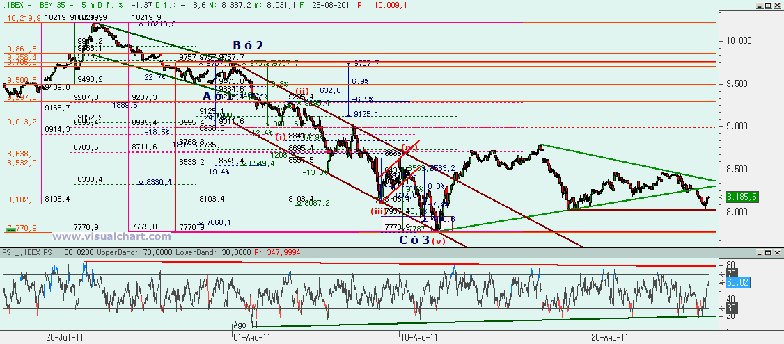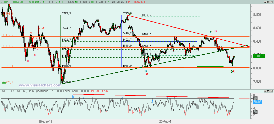 Domingo 28 de Agosto de 2011: Jornada con nuevas bajadas el Viernes que llevaron al Ibex de nuevo a los mínimos de la semana previa, aunque aún lejos de los mínimos del mes. El jueves habíamos señalado la existencia de un posible triángulo que podría ser una onda 4 desde máximos de julio, pero un triángulo en el que no confiábamos mucho por estar demasiado cerca de su vértice sin romper. Y el viernes lo rompimos por abajo, llevándonos por debajo de la alcista desde mínimos. Pero como ya dijimos que no nos parecía un triángulo bueno, vamos a ver otras opciones, siempre con la incertidumbre de si estamos realmente en una 4 y queda una 5 bajista o si hicimos una ABC y seguimos en el rebote. Veamos lo que nos dicen los gráficos.