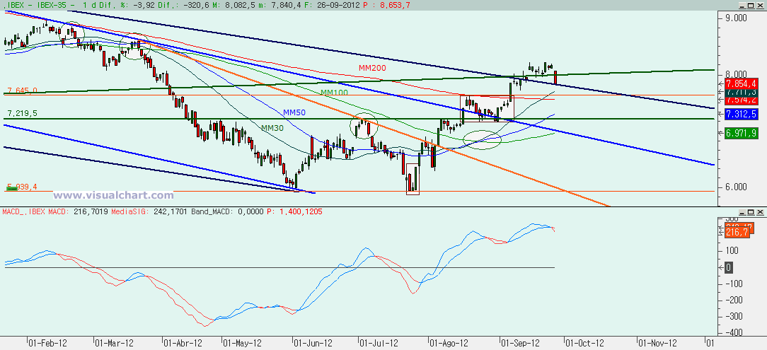 Miércoles 26 de Septiembre de 2012: Y tras mucho tiempo de subidas sin apenas descansos, hoy jornada fuertemente bajista en el Ibex para perder el 8.000. Este era el movimiento que esperábamos desde hace días, pero la pregunta ahora es hasta dónde puede llegar. Veamos los gráficos.