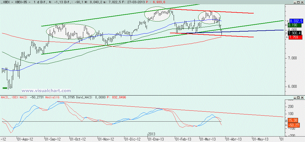 Nueva jornada bajista en el Ibex perdiendo las cotas que señalamos anoche y quedándonos en una nueva zona de soporte, como ahora veremos. No hay aún señal de giro alcista que nos permita pensar en que la caída ha acabado, pero vamos a verlo en los gráficos.